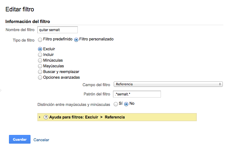 Para aplicar el filtro selecciona la vista que utilizas normalmente y crea un filtro como el de la imagen y fíjate bien en el Patrón del filtro pues es una Expresión Regular y hay que ponerlo exactamente igual: