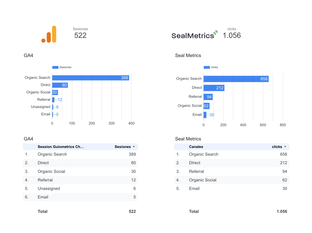 La herramienta ideal para contestar a esta pregunta es Seal Metrics porque no depende del consentimiento de cookies. Para verlo con claridad, se me ocurre montar un panel en Looker Studio poniendo a un lado las visitas de GA4 y a otro los clicks de Seal Metrics.