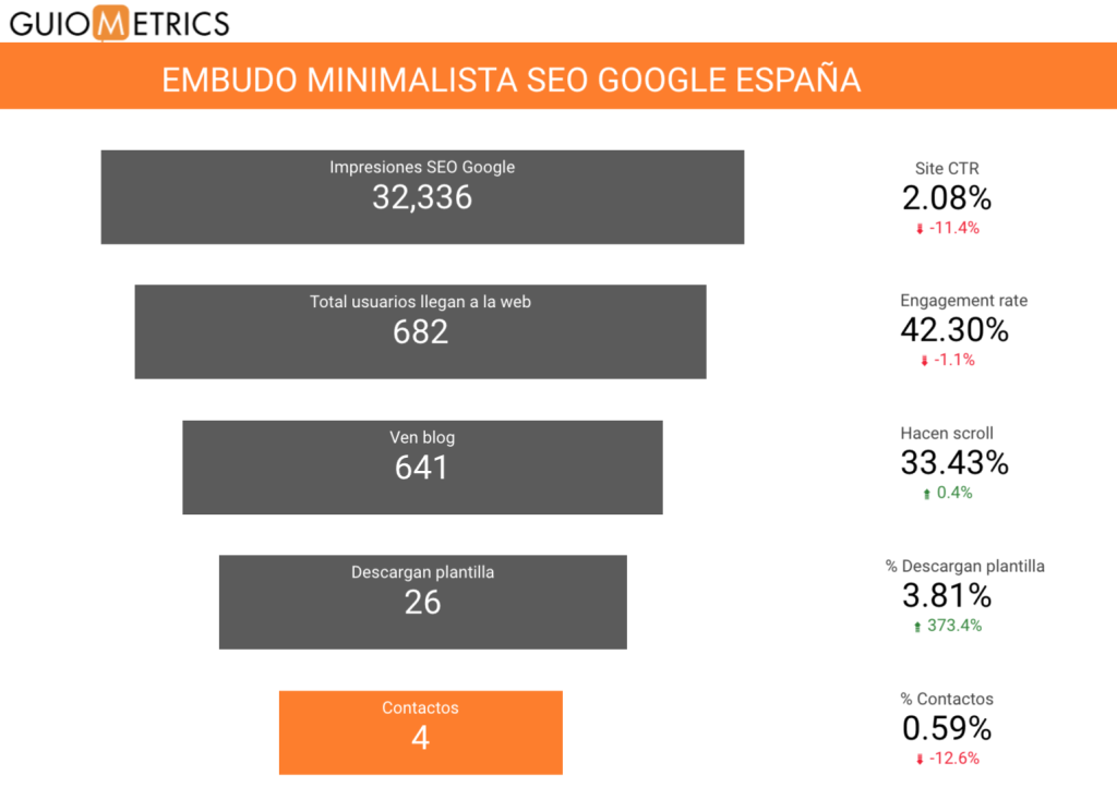 Como ves, un embudo minimalista es una forma sencilla de ver los datos pero efectiva y altamente accionable, pues rápidamente se puede ver dónde hay problemas y es necesario actuar.