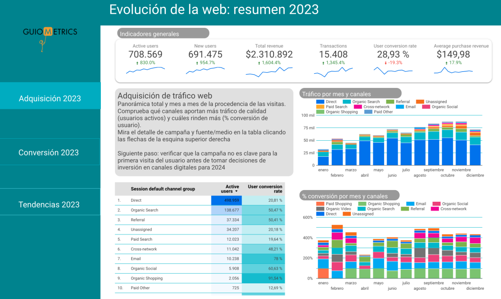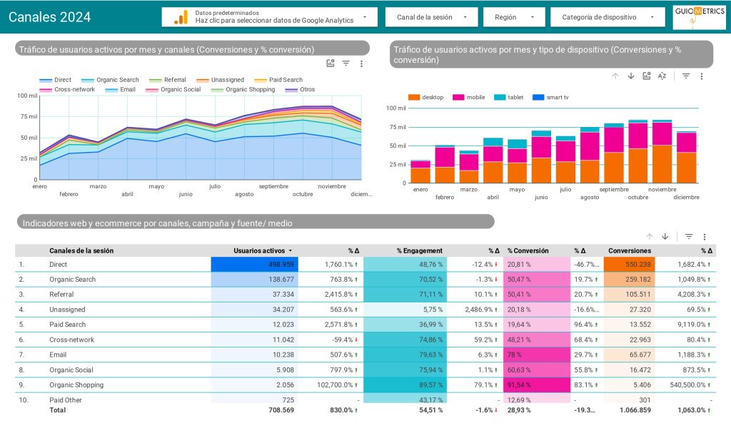 Dashboard en Looker Studio con 3 páginas de métricas y KPIs básicas para saber cómo fue 2024 en datos web. Clica aquí para acceder.