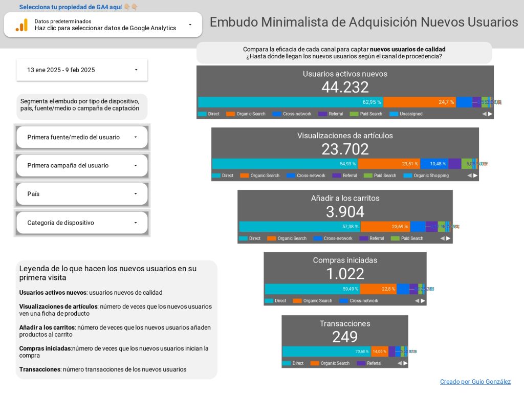 Para los que son menos expertos en datos, he diseñado un embudo bastante sencillo, para que rápidamente puedas detectar dónde poner el foco para conseguir nuevos usuarios. Y no distraerte con otras métricas o dimensiones. Clica aquí para acceder.