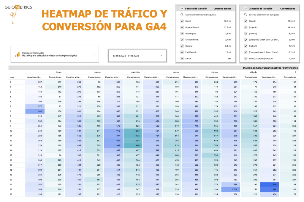 Otro mapa de calor, este además del tráfico de usuarios activos, muestra la conversión. Clica aquí para acceder.