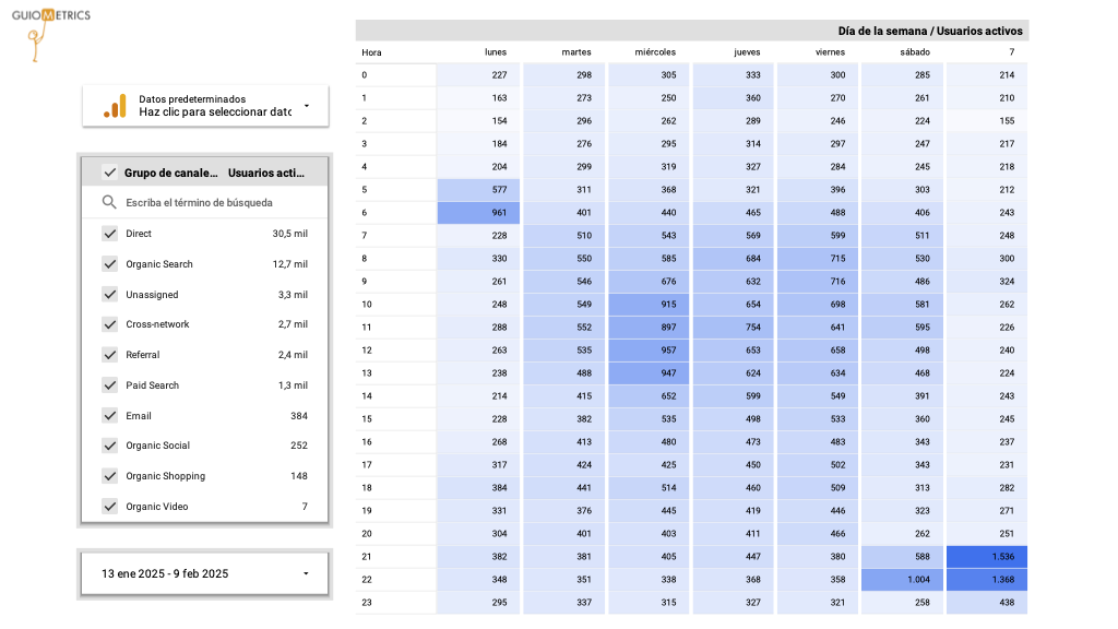 Mapa de calor para saber cuándo visitan tu web: las horas y días de la semana por usuarios activos